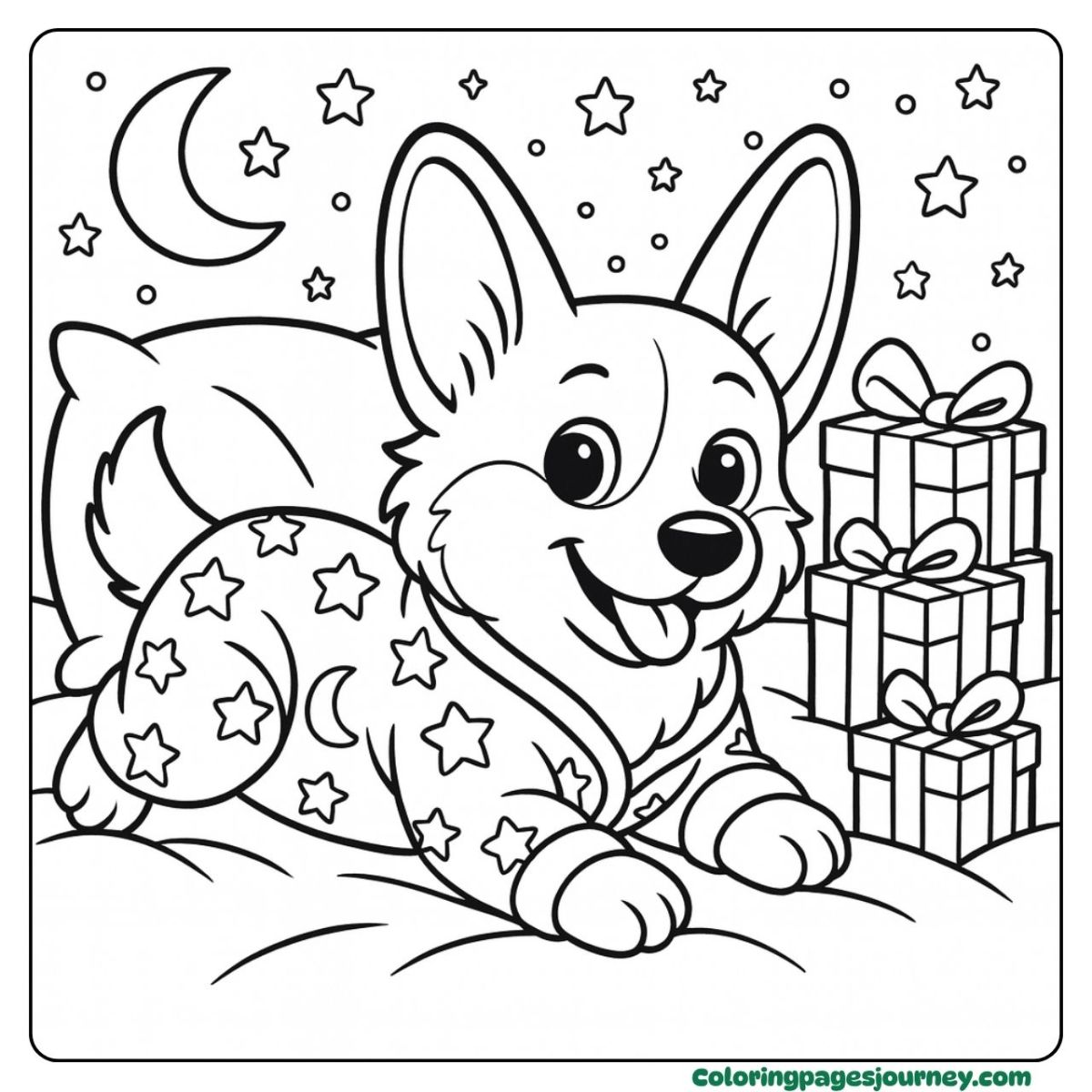 Color the fur in orangey-tan (as a real-life Corgi), PJs in navy, and the moon in soft yellow for bedtime warmth.