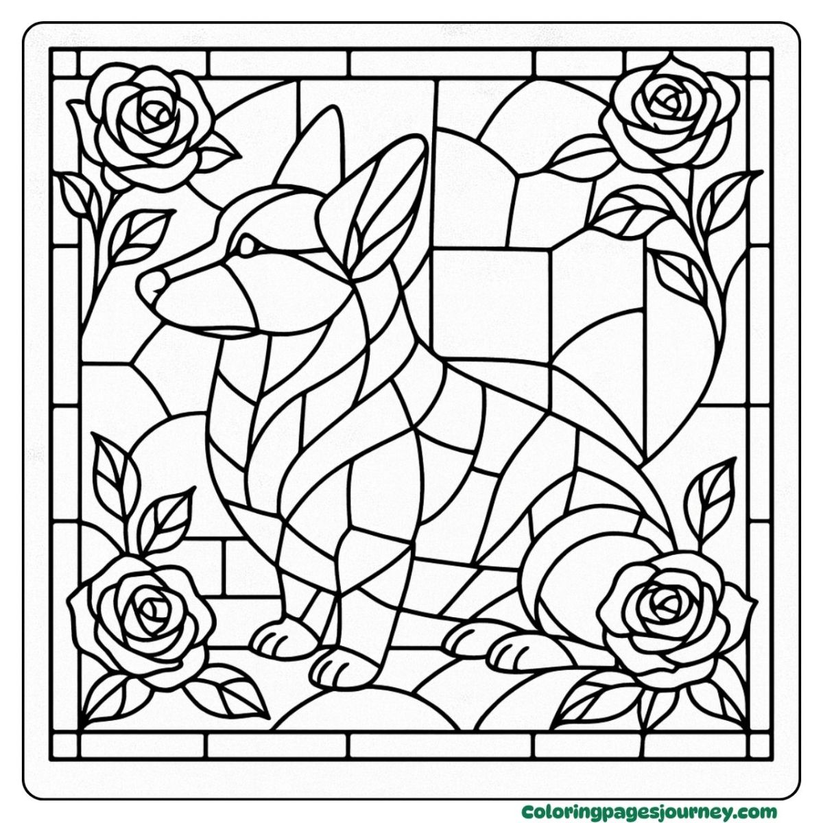 With ruby, cobalt, emerald, and amber hues, the dog stands out. Thin black lines hold the shine. The Corgi's pose resembles standing near a church window.