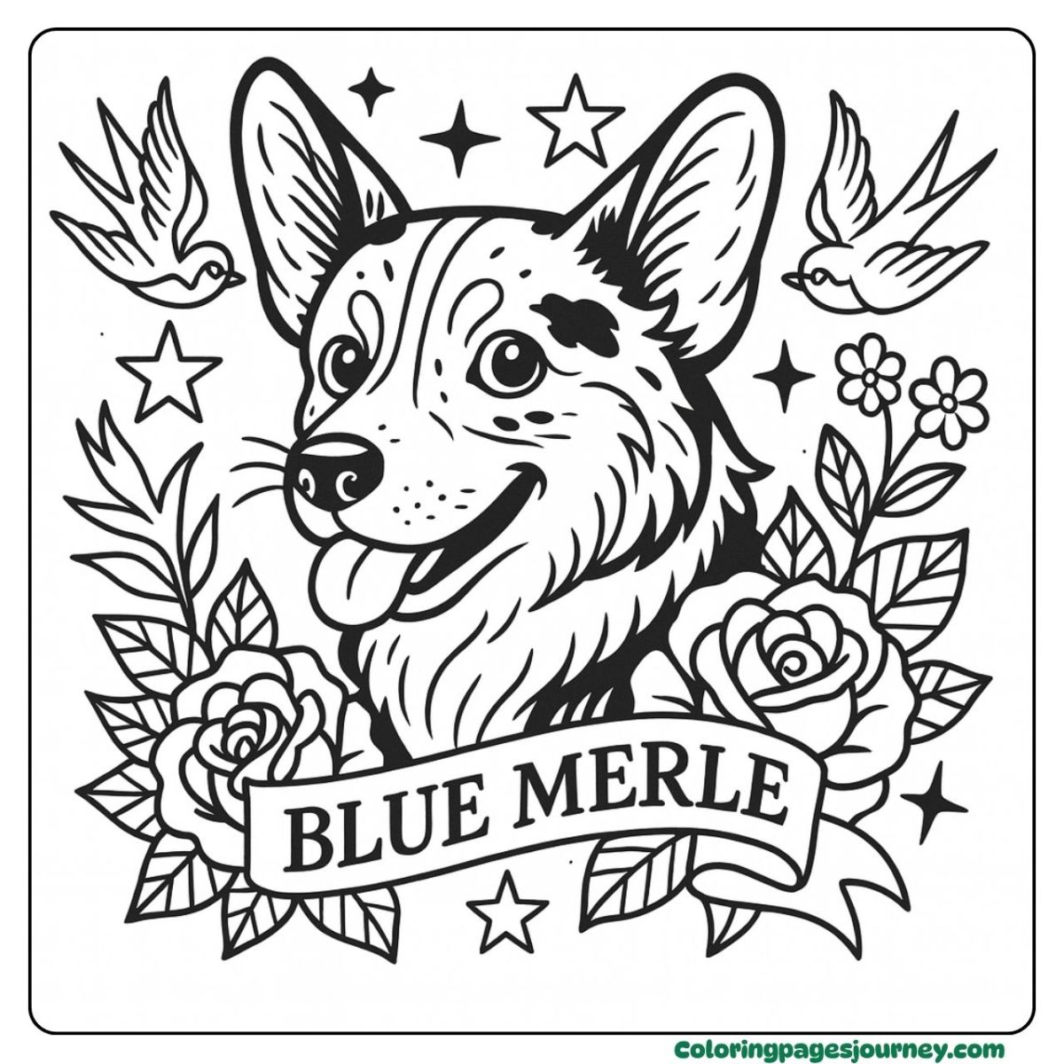 Slate blue, rust, and cool gray shape the merle coat. Deep red roses and leafy greens wrap the page in a bold tattoo look.
