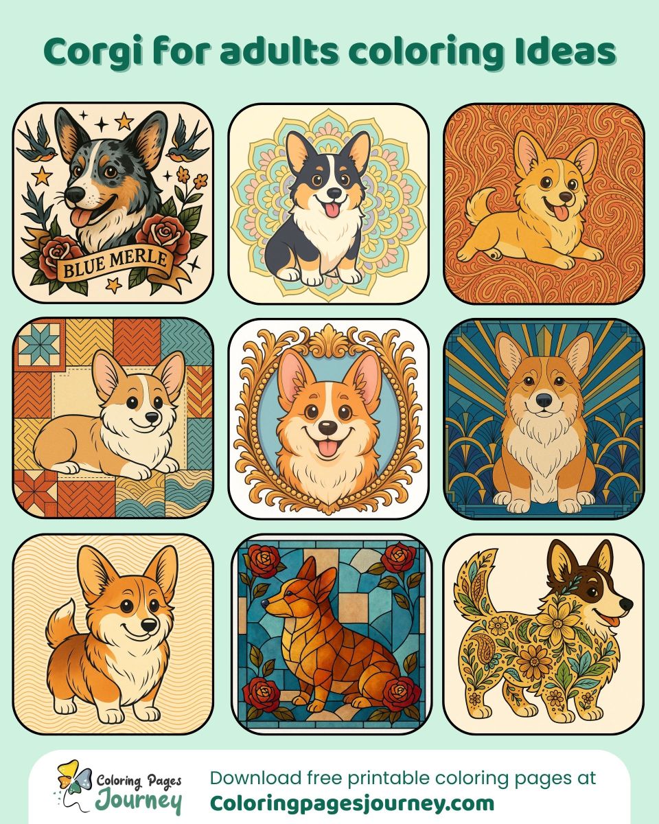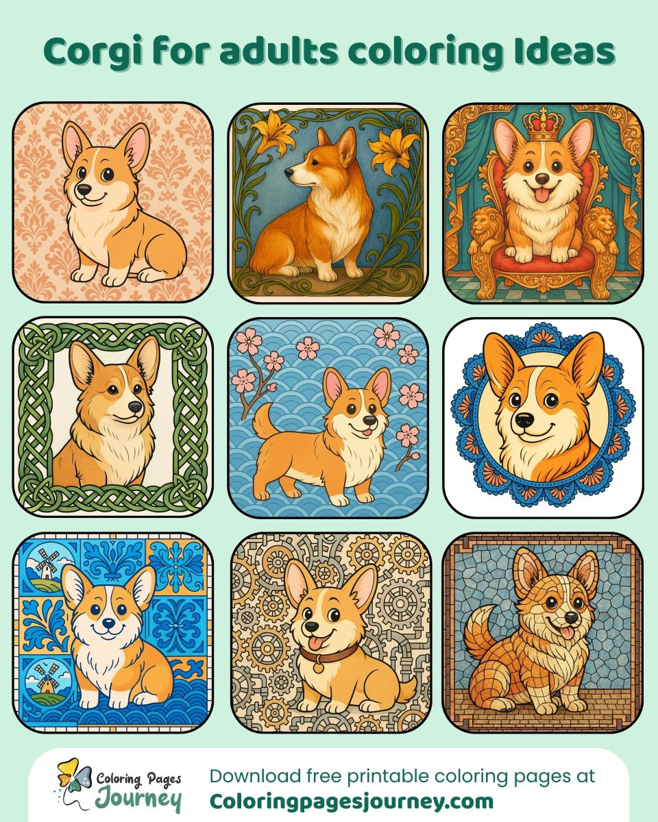 Once you’ve worked through this bundle, you can revisit the same Corgi adult coloring pages with new palettes or explore other Corgi and dog-themed sets on ColoringPagesJourney.