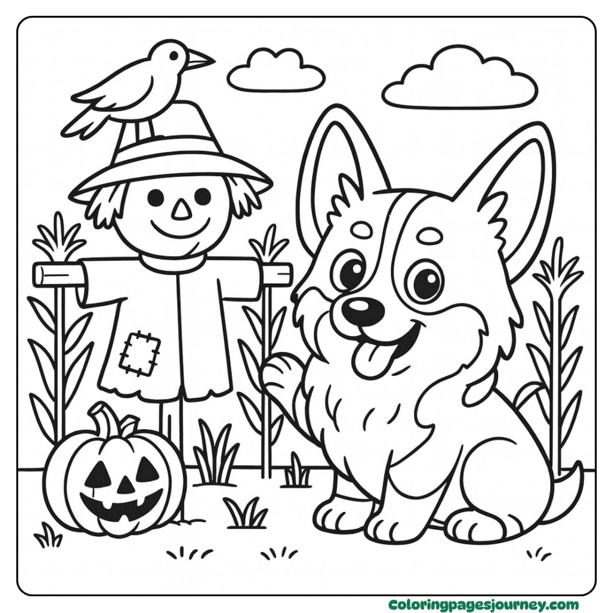 Fade corn stalks from green to gold, dress the scarecrow in denim and straw, paint the corgi soft tan, color the backdrop in a cozy sunset tone.