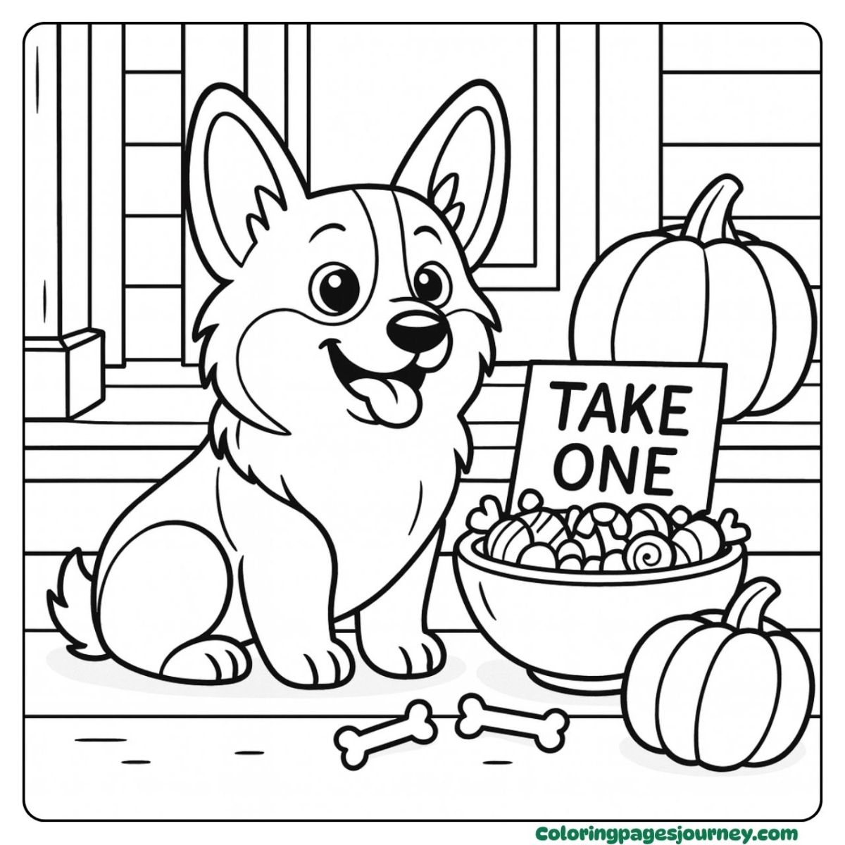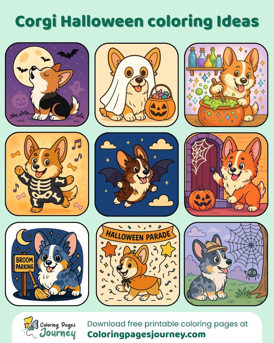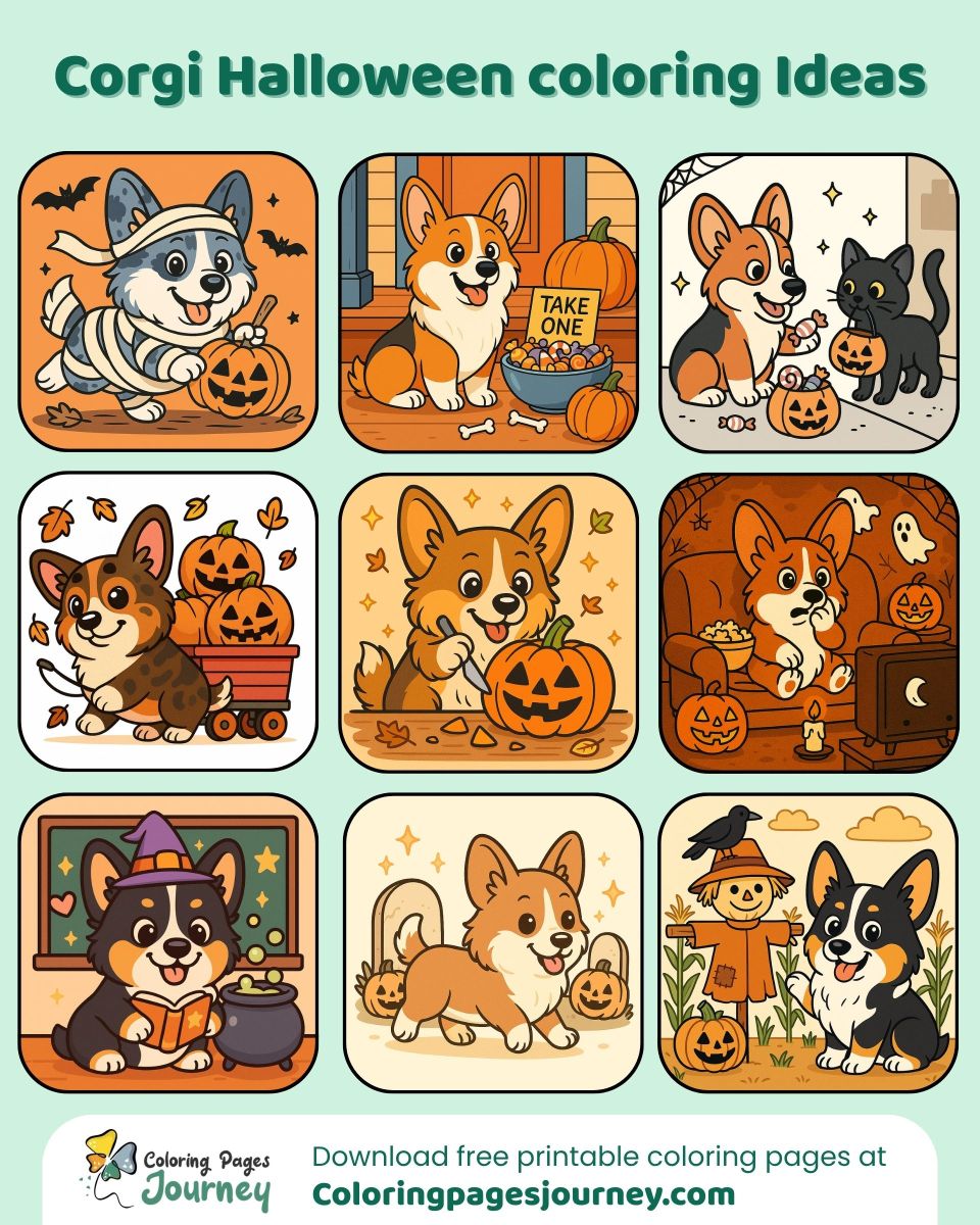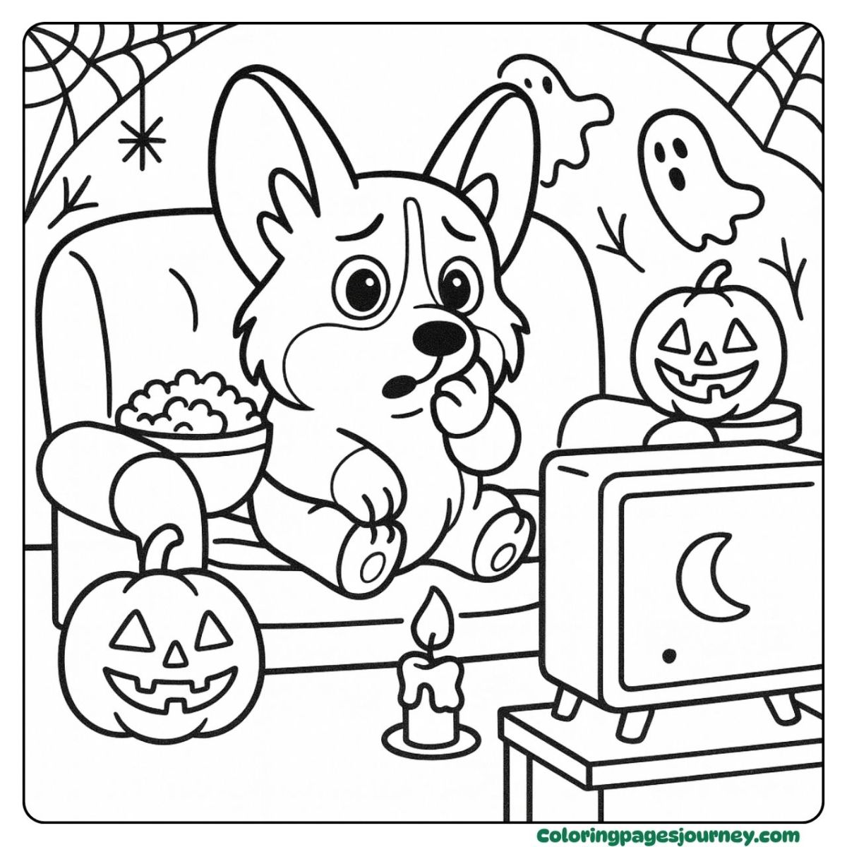 Corgi Halloween coloring pages are printable sheets that show one cute corgi moving through classic Halloween scenes—porch pumpkins, candy bowls, spooky movies, and more. Each page from ColoringPagesJourney is a small story you can print, color, and turn into simple holiday decor or a quick craft break.