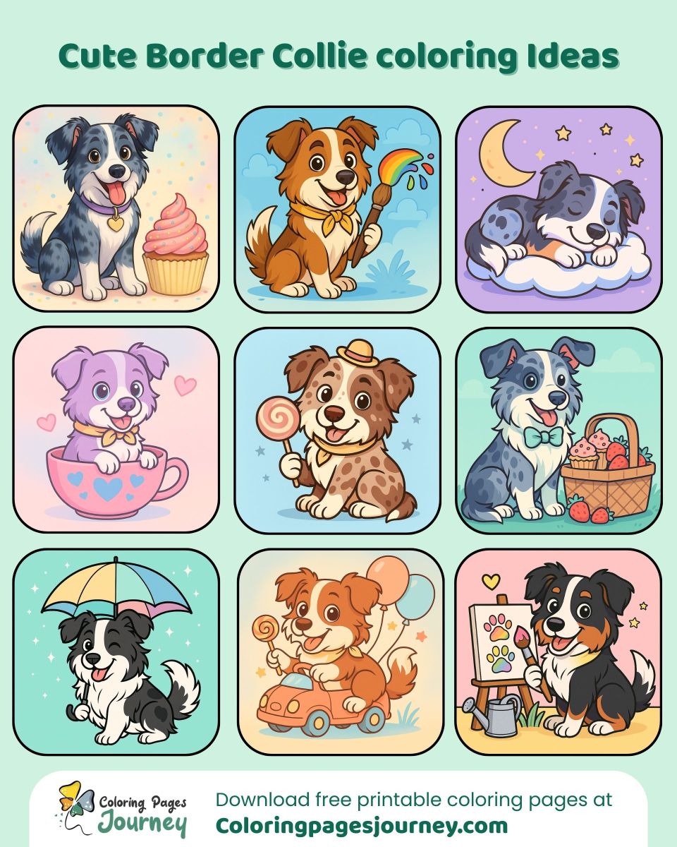 Ultimately, each Cute Border Collie coloring page weaves a small story that you bring to life with your colors—whether passing crayons around the table or unwinding alone as evening falls. These dog coloring pages load quickly, print clearly, and store easily for rainy days or whenever inspiration strikes. Head over to ColoringPagesJourney, grab the free set, pick your favorite, and let your imagination wander.