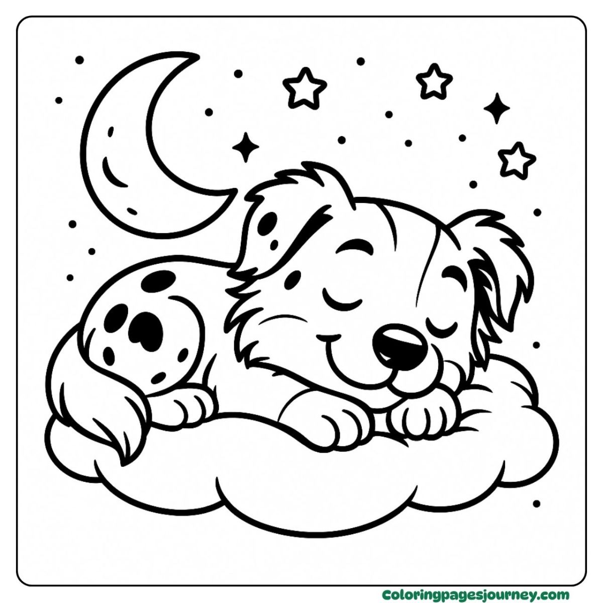 Ease into calm—this canine curls on a soft cloud beneath a crescent moon and twinkling stars. Dark fur against a purple evening sky creates a tranquil bedtime scene, ideal for slow, thoughtful coloring.