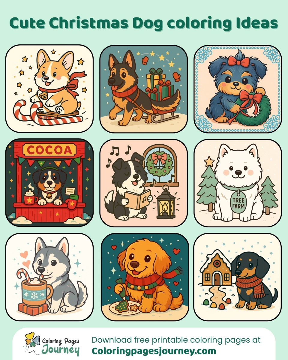 Every December evening, I'd find myself wandering back to that tiny desk in the corner, steam rising from a forgotten mug of hot cocoa next to my worn-out sketchpad, while the neighborhood outside fell into a quiet hush. It all kicked off with a corgi riding a candy cane sled, then a husky sipping cocoa, a little dog guarding a gingerbread cottage, and many more. Deep down, what I yearned for were Cute Christmas dog coloring pages that played out like tiny winter stories—not stiff outlines that fade from memory in a flash. So that's what drove me to gather my favorite Christmas Dog pictures to color into this cozy bundle with 18 crisp PDF sheets right here on ColoringPagesJourney. Print, share, or blend them into your own holiday mementos.