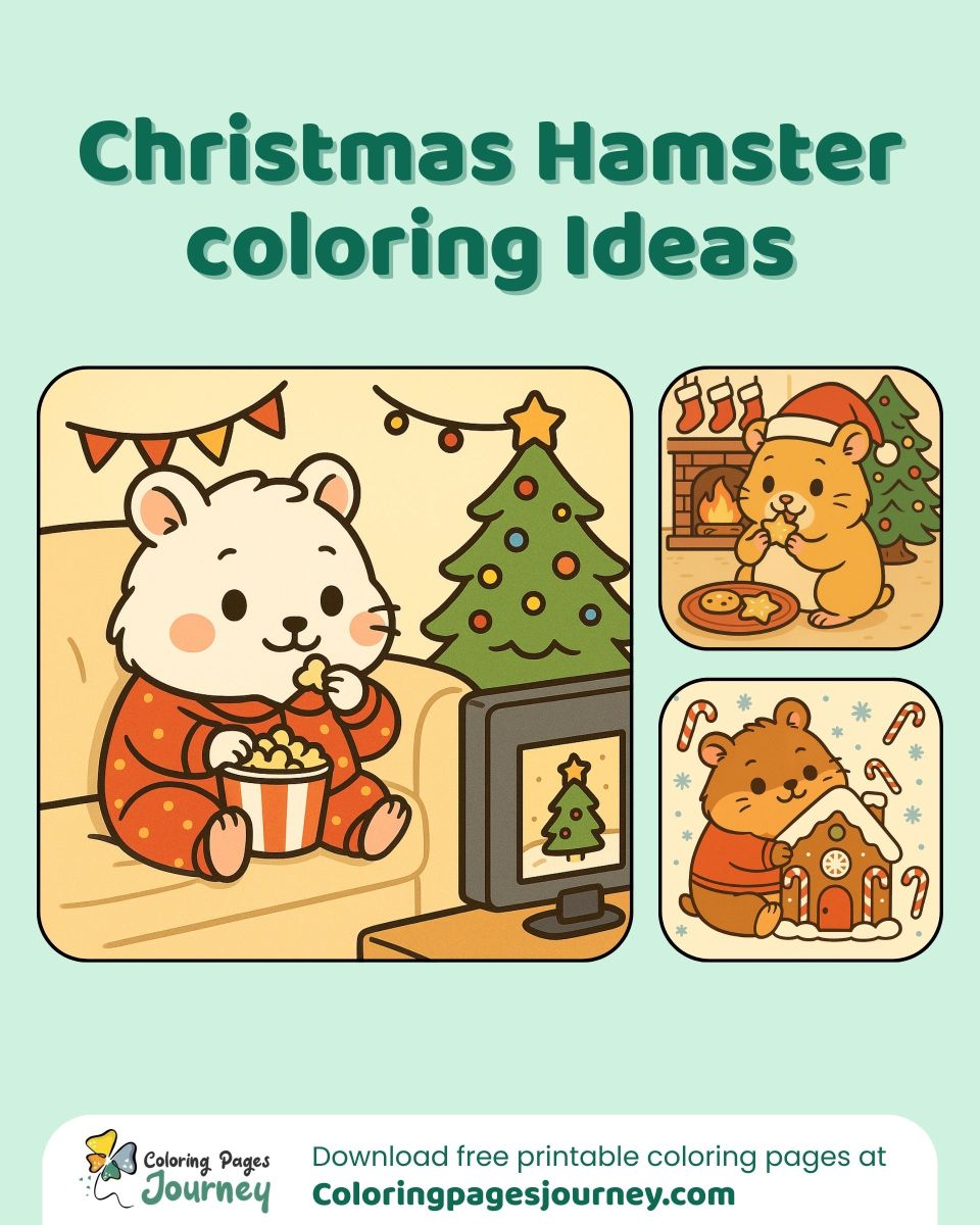 The holidays should be warm and fun — that's what these Christmas hamster coloring pages bring to your home. I've drawn hamsters wearing little scarves and holding candy canes. Some put decorations on tiny trees while snow falls around them. I left lots of white space so you can add glitter, stickers, or whatever you like. They make great cards or gifts.