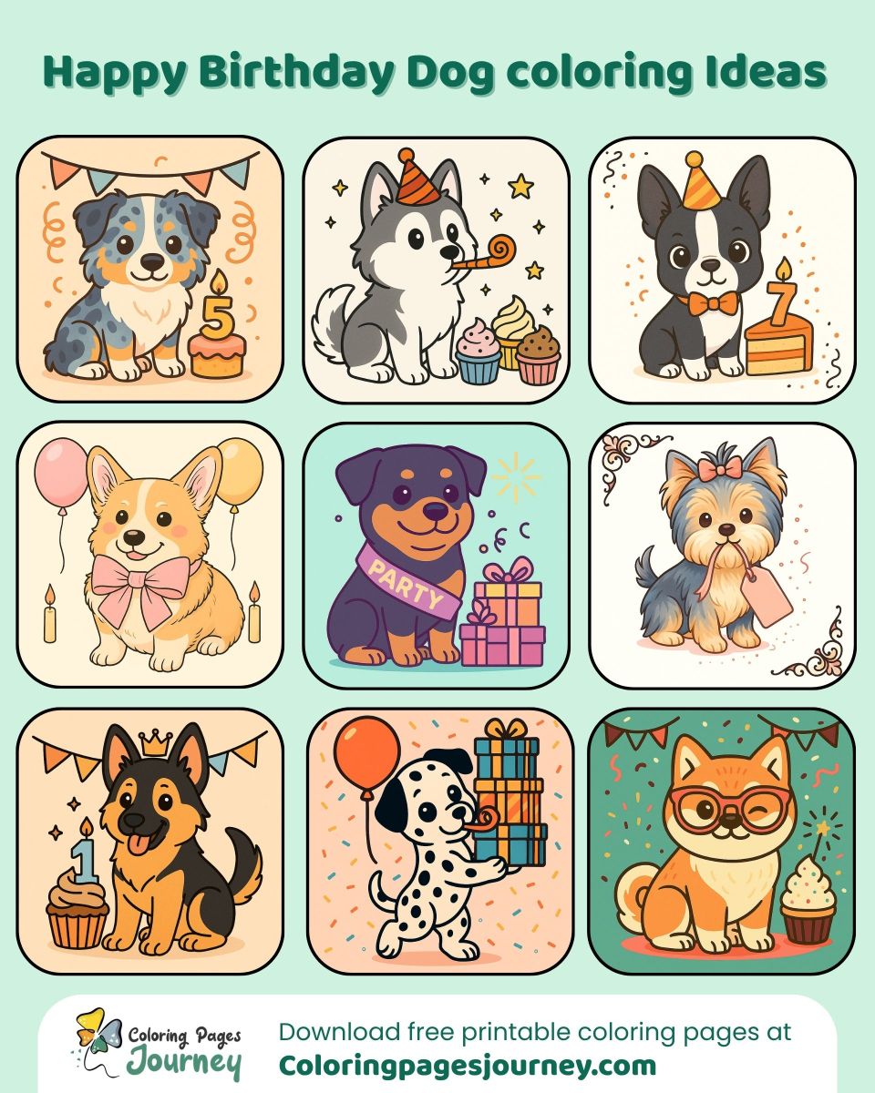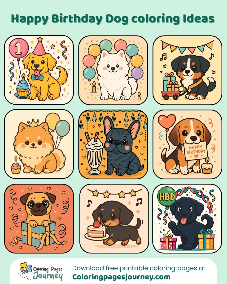 All the birthday dog printables are hosted at ColoringPagesJourney. Browse the puppy party collection, choose your favorite designs, and download the high-resolution files in just a few clicks.