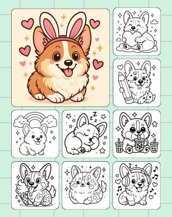 Finally, the Kawaii Corgi coloring pages pack gives space to relax, a bit of magic, and quiet moments you can shape as you like.