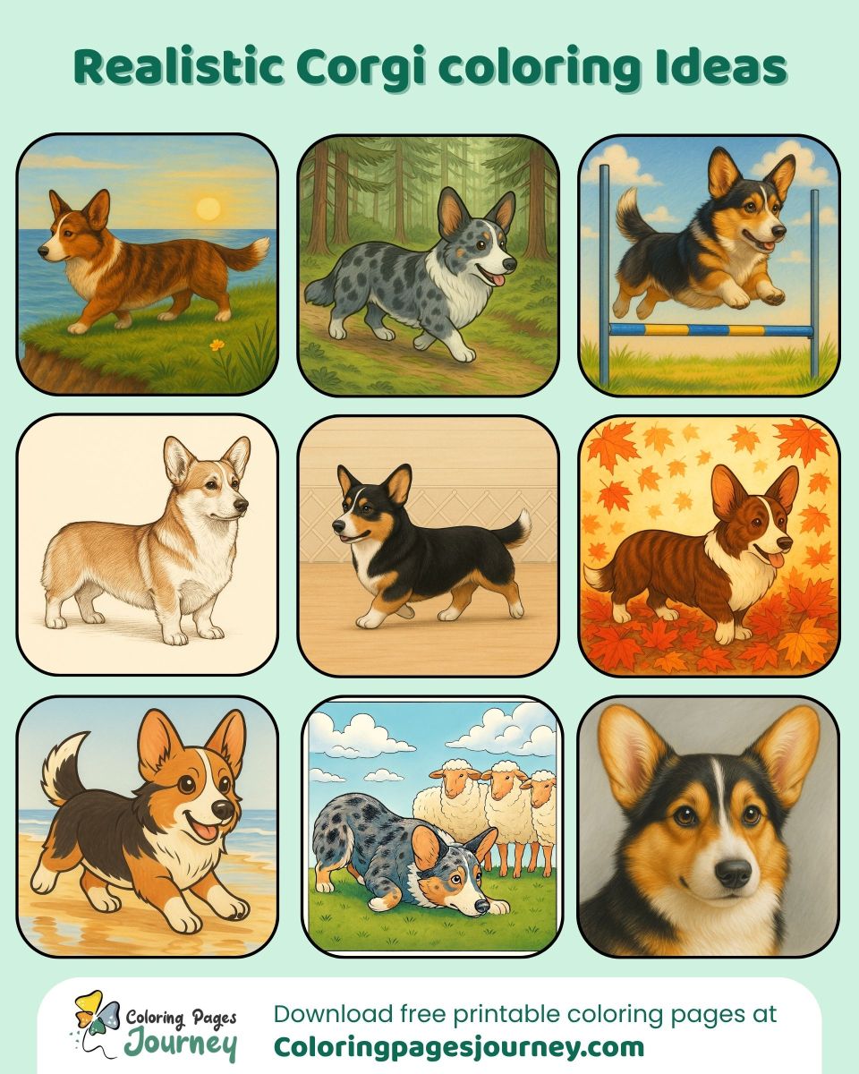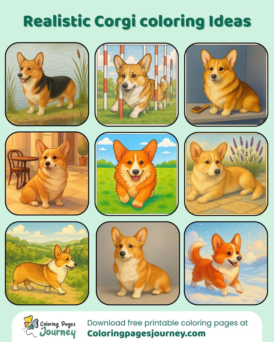 Yes. All of the realistic Corgi printables in this collection are free to download on ColoringPagesJourney. You can grab single pages or the full bundle without paying, then print or use them on your device.