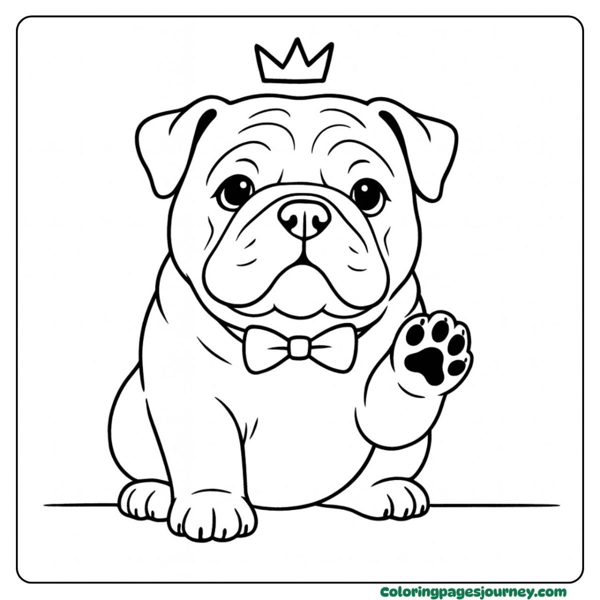 Creamy white body, caramel shading around those perfect wrinkles and ears, mustard bow tie for a pop of sass. The soft peach background lets his little crown and raised paw steal the show.