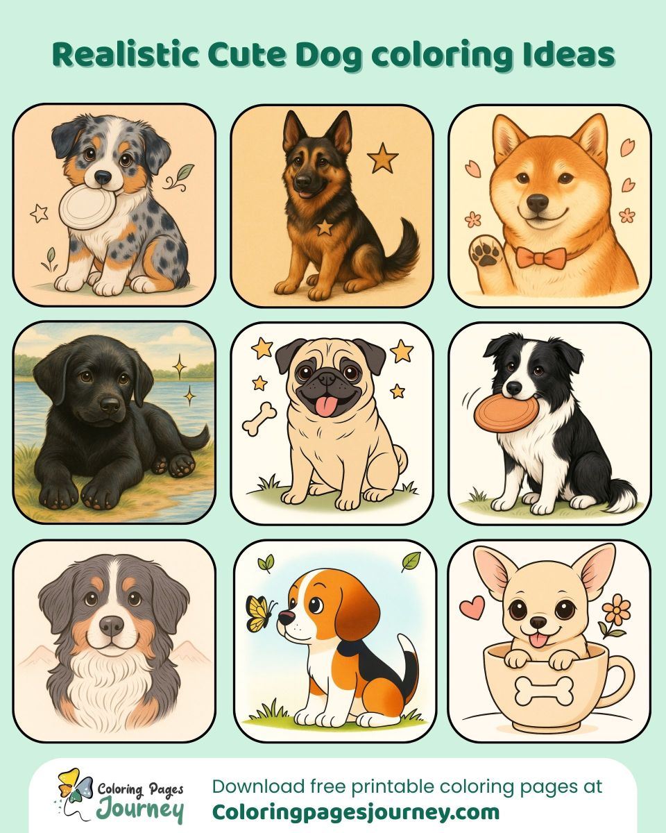 You can grab the entire pack on ColoringPagesJourney. Just visit the Realistic Cute Dog Coloring Pages post, choose your favorite format, download the files, and press print whenever you are ready for a cozy, dog-themed coloring session at home.