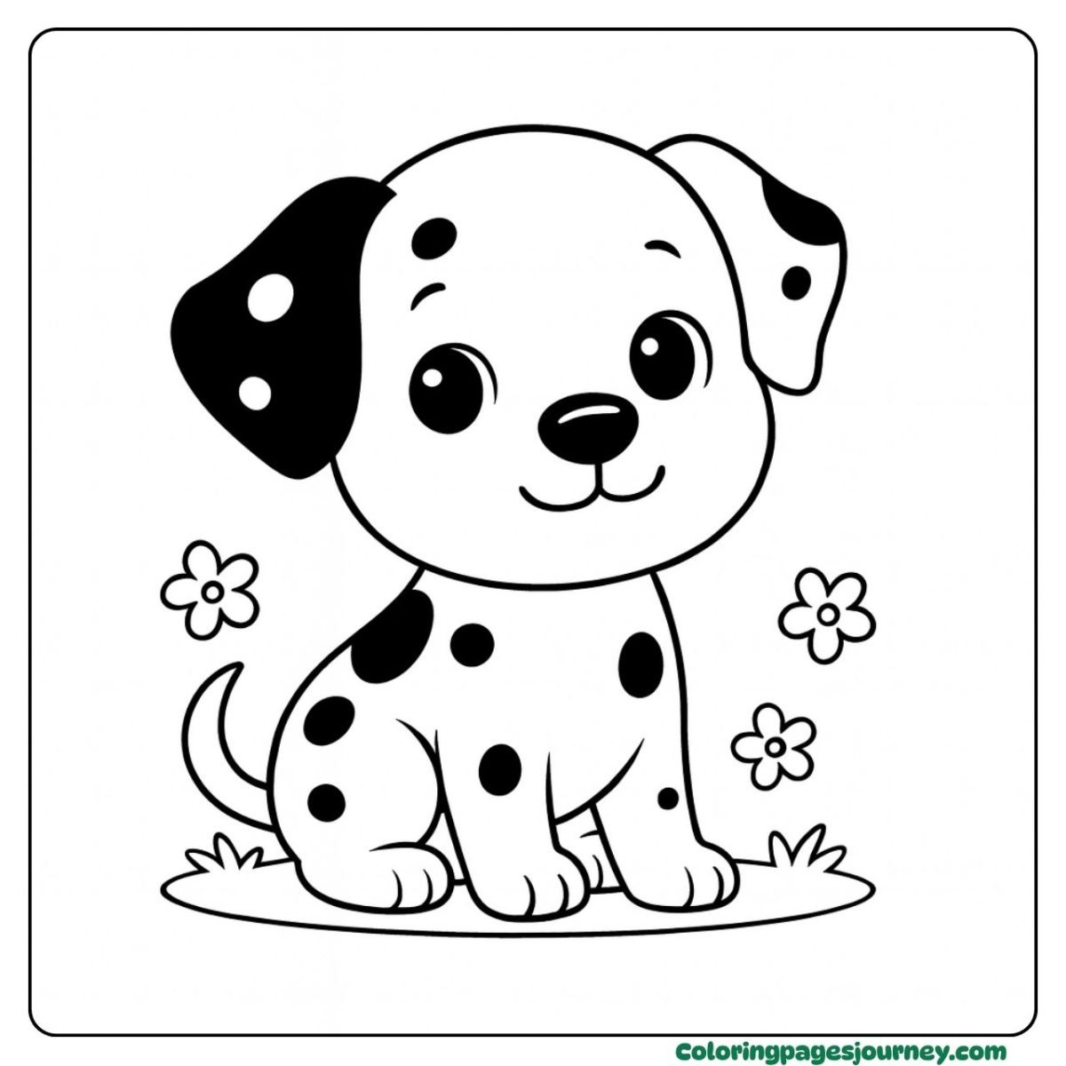 Color the Dalmatian in a crisp white coat and bold black spots. Spring greens and soft wildflowers surround him—this page basically colors itself in ten joyful minutes.