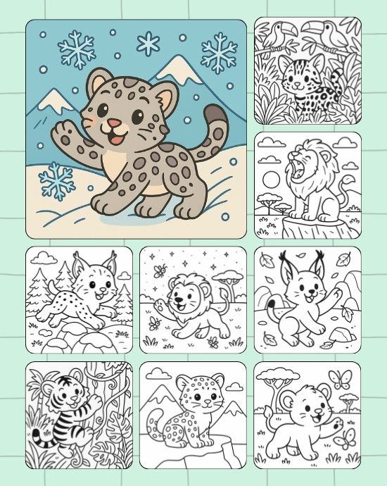 Rain taps the window while the printer slides out a page. Small hands reach for orange because a tiger waits. Winter brings a snow leopard as pale ice settles under paws. Weekend sun lifts a lion when the wide sky opens. Short lines trace mane and breath; chunky strokes steady tiny grips. Keep it short and sweet—few tools, clear steps, quick wins. Watch the room exhale.